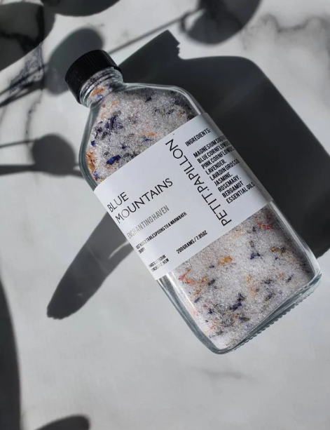 This gentle, nurturing, soothing combination of epsom salts, organic botanicals of lavender, pink and blue cornflowers with essential oils of French rosemary, bergamot, lavadin grosso and jasmine is simply divine.